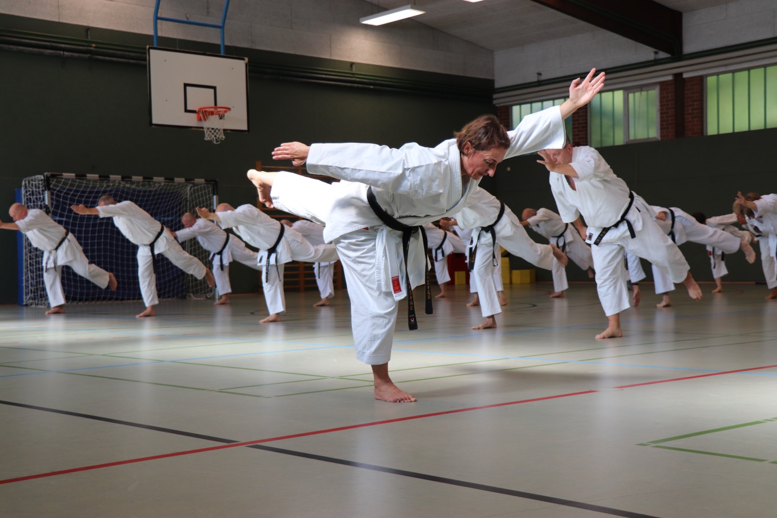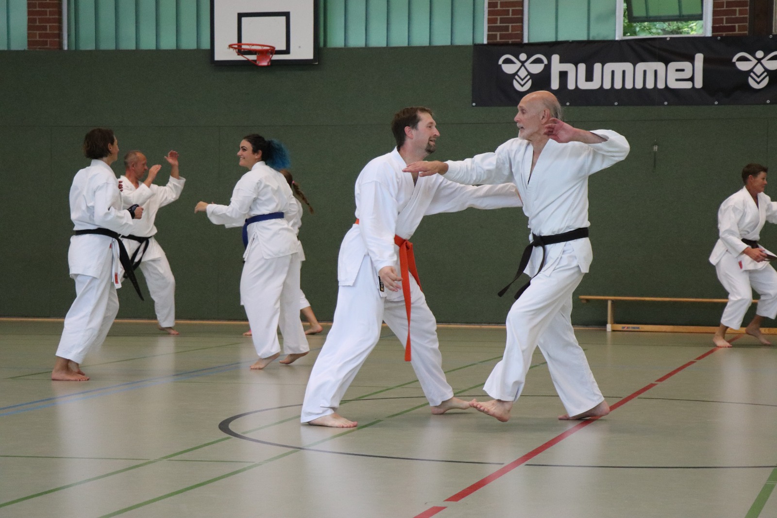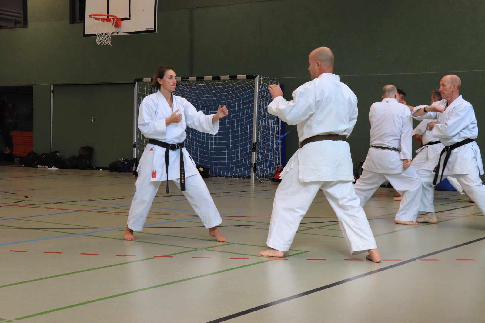 Der Lehrgang fand in den Räumlichkeiten des mediFit statt und wurde vom KDNW Vizepräsident Stefan Krause (7.Dan / Schwarzgurt) geleitet. Der Lehrgang thematisierte die Kata (Abfolge von festgelegten Techniken) „Enpi“. Dazu gab es zunächst ein gemeinsames Aufwärmprogramm von Grün Weiß Trainerin Patricia Schneider mit dem „Kokoro Physical Training“ (ganzheitliches Faszientraining für Kraft, Balance und Flexibilität). Anschließend übernahm der Lemgoer Trainer Stefan Krause. Er brachte den motivierten Karateka den Ablauf der Kata näher. Des Weiteren teilte er sein Wissen im Bereich Bunkai (Anwendung der Technik). Nach der Mittagspause folgte der Bereich Kumite (Freikampf mit Partner). Den Abschluss bildete Grün Weiß Trainer André Dawson mit einer Einheit zur Selbstverteidigung in Bezug auf die zuvor eingeübte Kata.