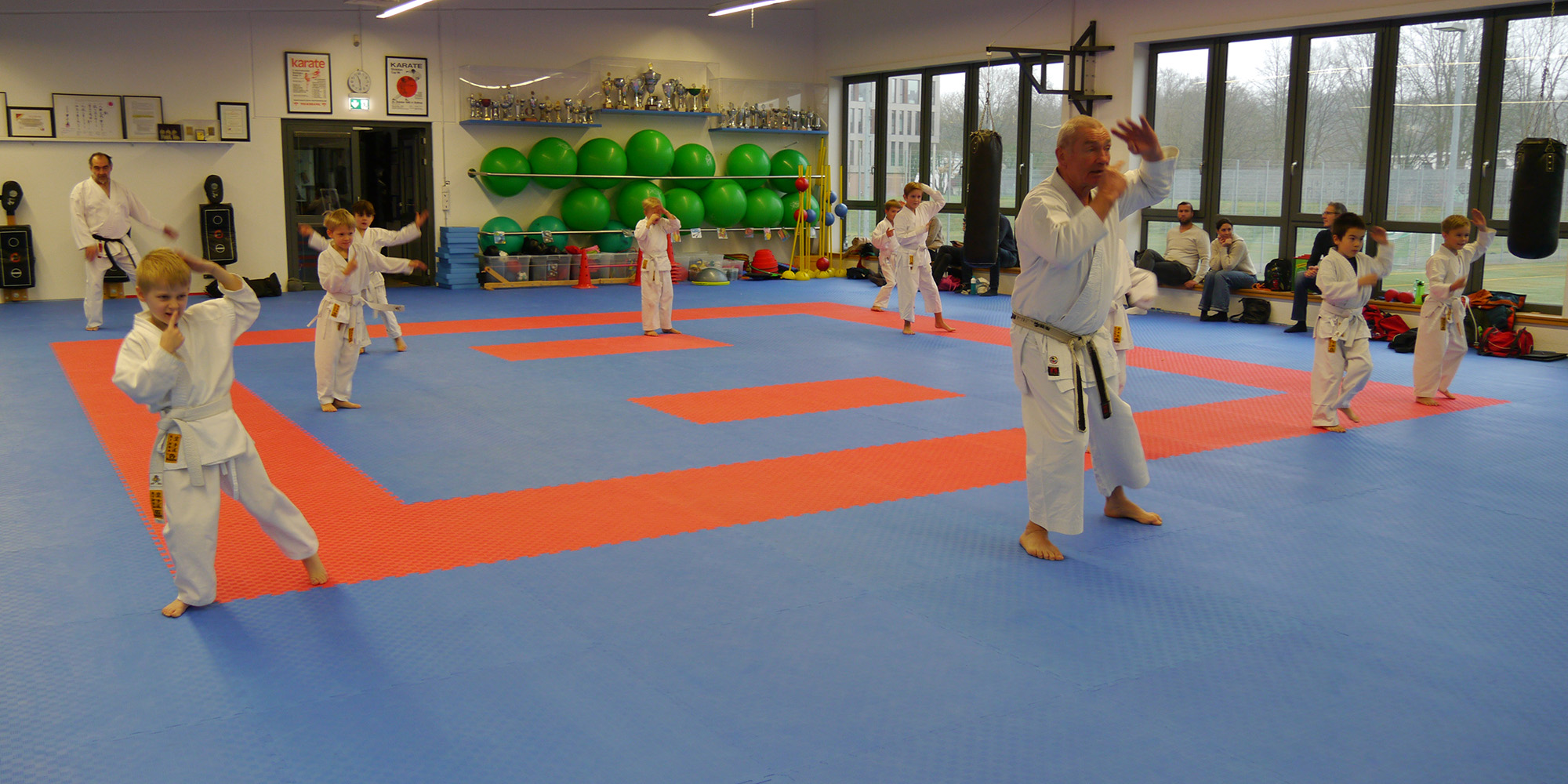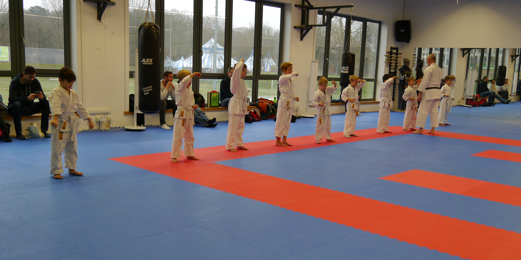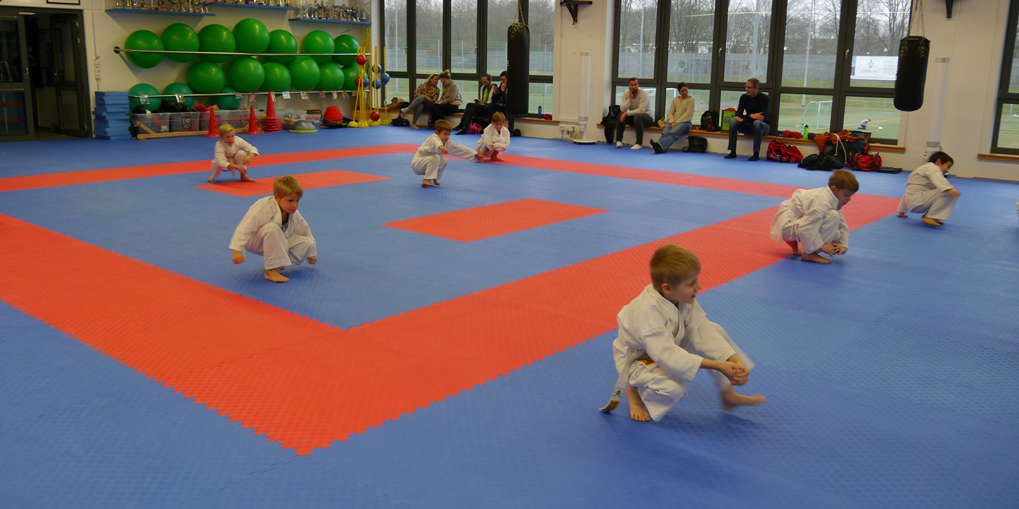 Die Kinder der U8 Gruppe absolvierten am Samstag, den 14.12.2024, ihre erste Kyu-Prüfung (=Gürtelprüfung) zum gelb-weißen Gürtel. Die neun motivierten Kinder zeigten ihre erlernten Fähigkeiten vor dem Prüfer- und Trainerteam, bestehend aus Johannes Bracke, Alessandro Dell´Aere und Marla Uttermann. Dabei zeigten sie innerhalb ihrer einstündigen Prüfung hervorragende Leistungen in den Bereichen Kihon (Grundtechniken), Kumite (freier Kampf mit einem Partner, bei den Kindern ohne Berührung) sowie motorische Fähigkeiten wie Radschlag, Rolle vor- und rückwärts, Seilchenspringen, Hampelmann, Parcours, etc. Nach der anstrengenden Prüfung bekamen die stolzen Prüflinge ihre Urkunden und Gürtel verliehen.